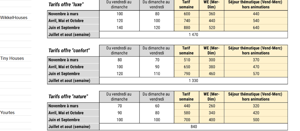 | Location yourte / semaine | 60 € | 160 € |